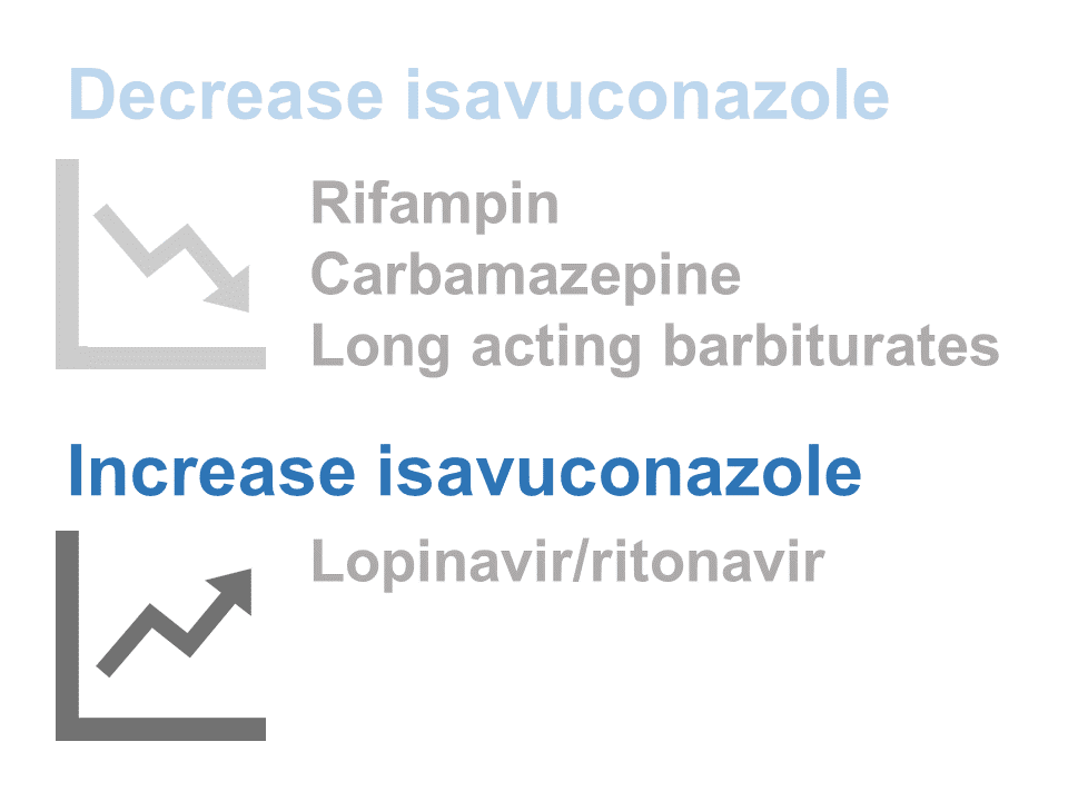 Rifampin 和 azole 類藥物是絕對禁忌症。但好消息是,因為 isavuconazole 較沒有作用在 CYP2C9 / CYP2C19,所以以往交互作用的常客 warfarin,這次就不在名單裡面啦。